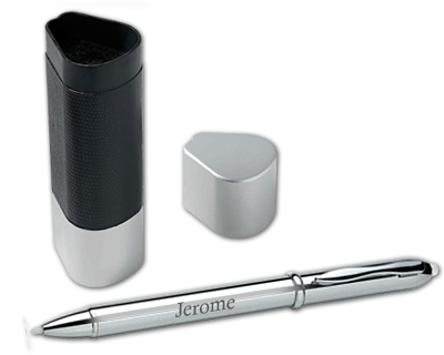 Stylo argenté personnalisé par gravure de votre prénom avec pointeur intégrée livré dans son coffret prestige.