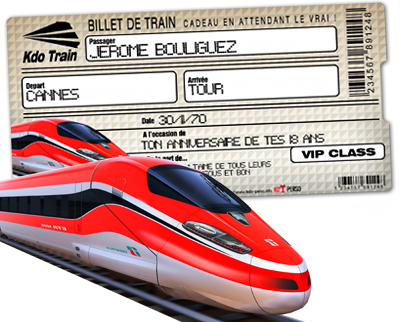 Vous compter offrir un voyage en train surprise mais impossible d'acheter le vrai billet ? les dates de départ et d'arrivé sont incertaines ? vous ne connaissez pas les dates de congés du passager ? va avait un doute sur la destination ou la gare de départ ? Personnalisé et imprimer ce faux billet de train cadeau en attendant de mettre au point le voyage et d'acheter les vrais billets de train.