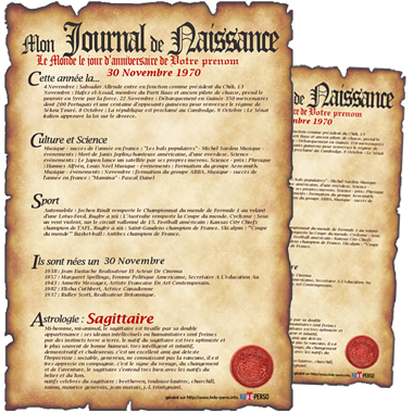 Saisissez votre nom, prénom, date de naissance et vous obtenez un superbe parchemin personnalisé comportant : actualités de l'année de naissance, faits culturels et sportifs, célébrités nées le même jour, horoscope, etc.