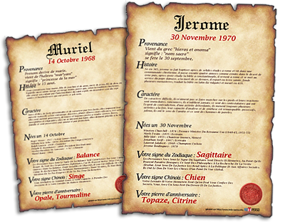Sur un superbe fond de parchemin, vous découvrirez les origines (traduction dans la langue d’origine du prénom) et la provenance (grec, latin, arabe,… ?) de celui-ci, une courte histoire vous racontera un fait historique marquant d’une personne ayant eu ce même prénom, un large chapitre sera consacré aux caractères des personnes portant ce prénom : vous verrez, c’est bluffant de vérité, une liste de célébrités nées le même jour sera fournie, le signe du zodiaque et l’horoscope en quelques lignes, le signe chinois accompagné de ces principaux traits de caractères et pour finir, la pierre d’anniversaire.