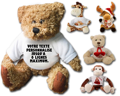 Offrer une peluche avec votre message personnalisé sur son t-shirt. 5 animaux différents : ours brin, ours blanc, girafe, renne, singe.
