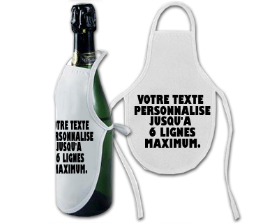 mini-tablier pour bouteille avec votre message personnalisé en tissu blanc 100% polyester, 270 g/m², bordure bleue. Format (L x H): 17 x 28 cm